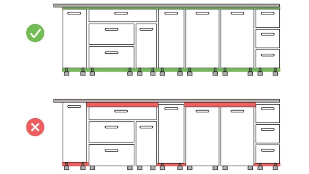 Placez toutes les pièces fabriquées de la surface dans leur position finale sur les armoires, sans adhésif. Vérifiez que la surface soit droite et de niveau au moyen d’un niveau et d’une longue