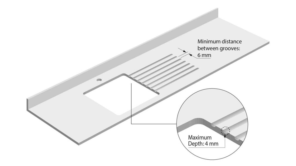 Drainer grooves are a feature cut into a solid countertop to help water drain off the countertop into the sink. Several grooves are milled into the countertop surface, serving as a permanent draining board.