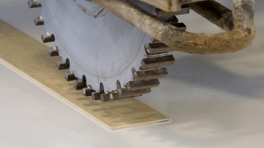 If the saw blade is not big enough to cut completely through the slab, cut half way through, turn the slab over, and continue cutting from the other side.