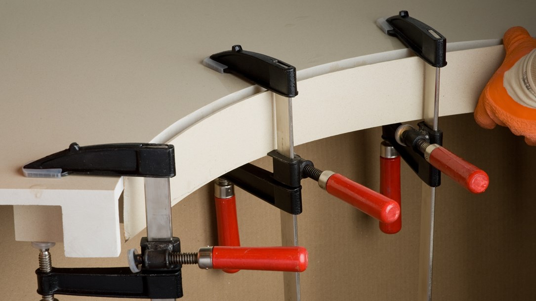3. Prepare to clamp the material to the surface by placing the clamps along the edge of the curve.